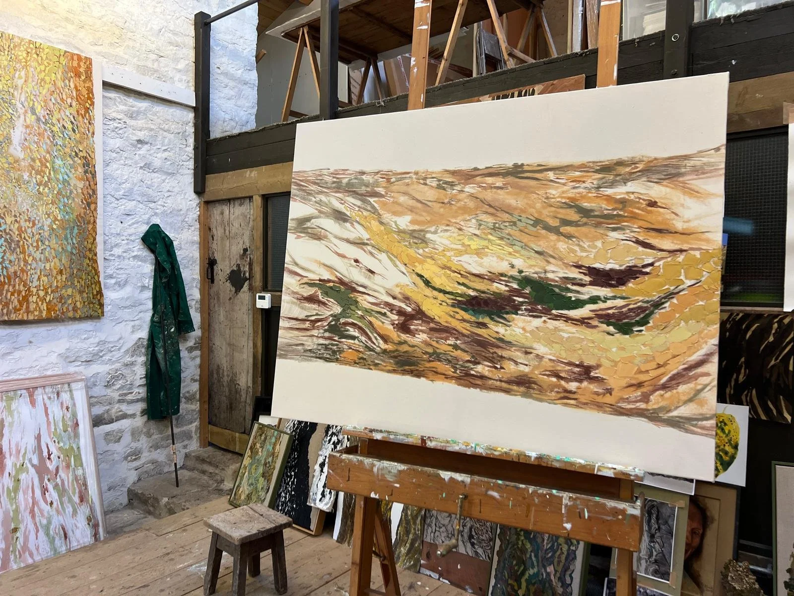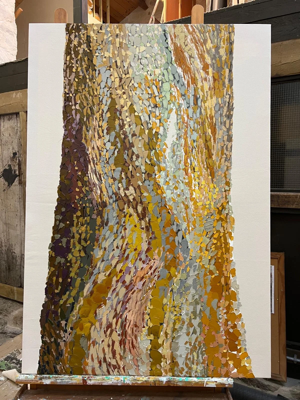 These works explore not only the swirling bark but also suggest the internal structure of capillaries moving through the branches which circulate water and nutrients, enabling the tree to flourish. Both of these elements translate to gestural lines and textured layers within the paintings creating a dialogue between the exterior and interior structures. The colours Black uses are a mix rich umbers and yellows contrasting against against the intense blues mirrioring the harsh desert light. The brushrokes range between the pieces from swirling, expressive movements to controlled stippling of paint creating dappled light over the peeling bark.