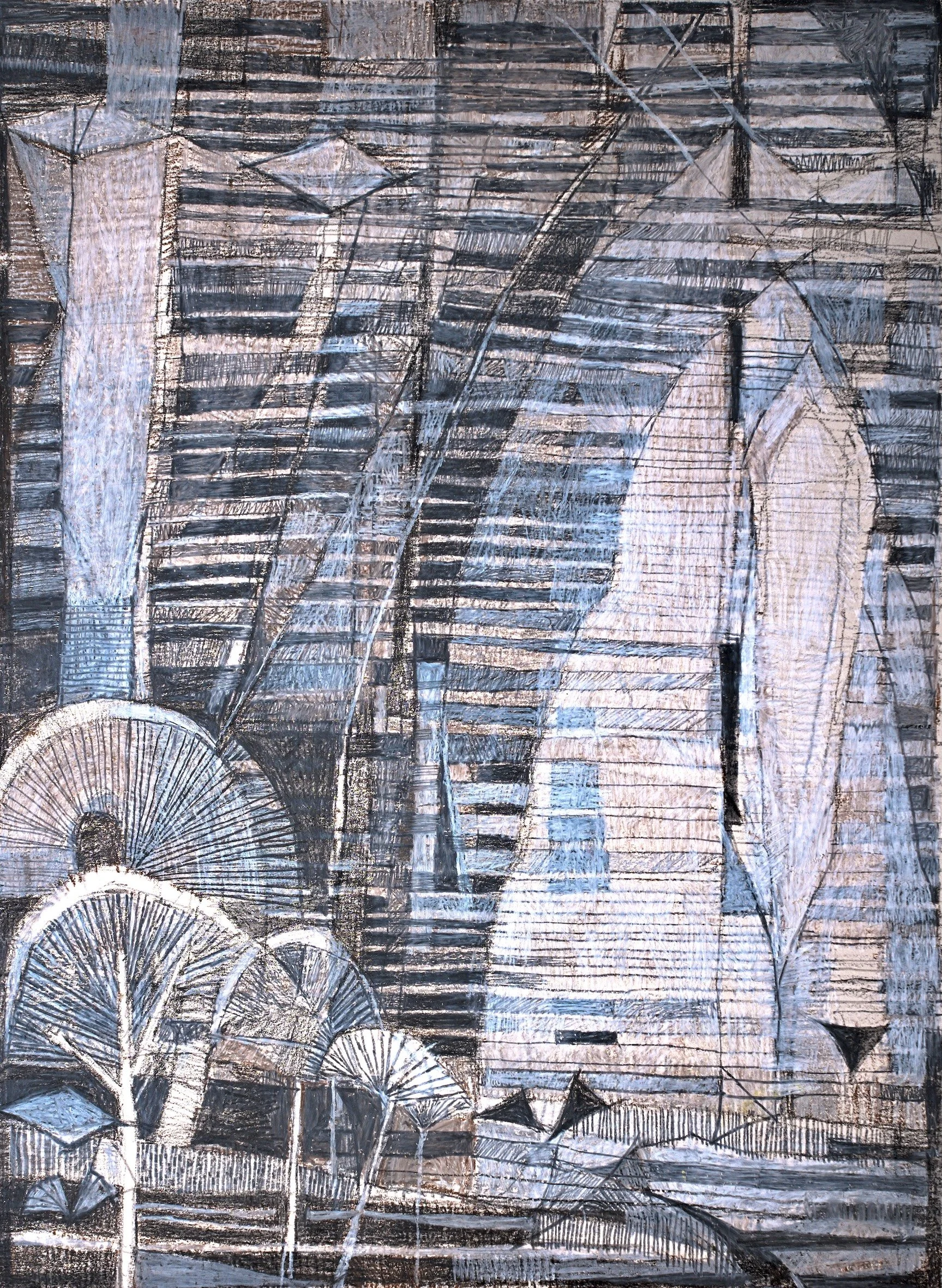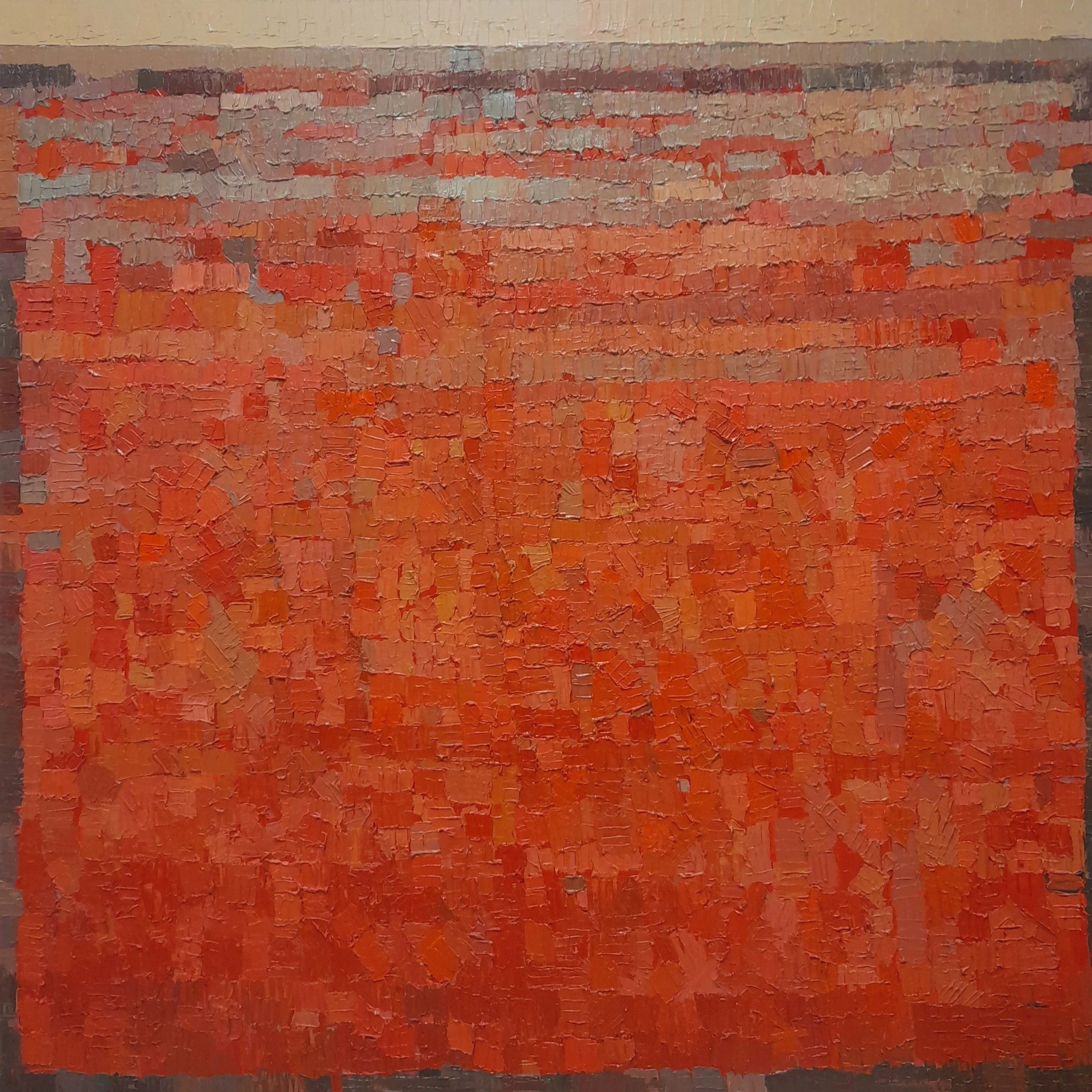 A recurring theme in Attree’s work are the pantile rooftops in York. He explained that when the city is viewed from above, York Minster looks as if it is, ‘floating on an ocean of red tiles.’. This particular view is something he has explored at length. These works are further informed by Philip Guston’s early abstract painting Zone (1953-1954), which features a similar sculptural line and rich colour palette.