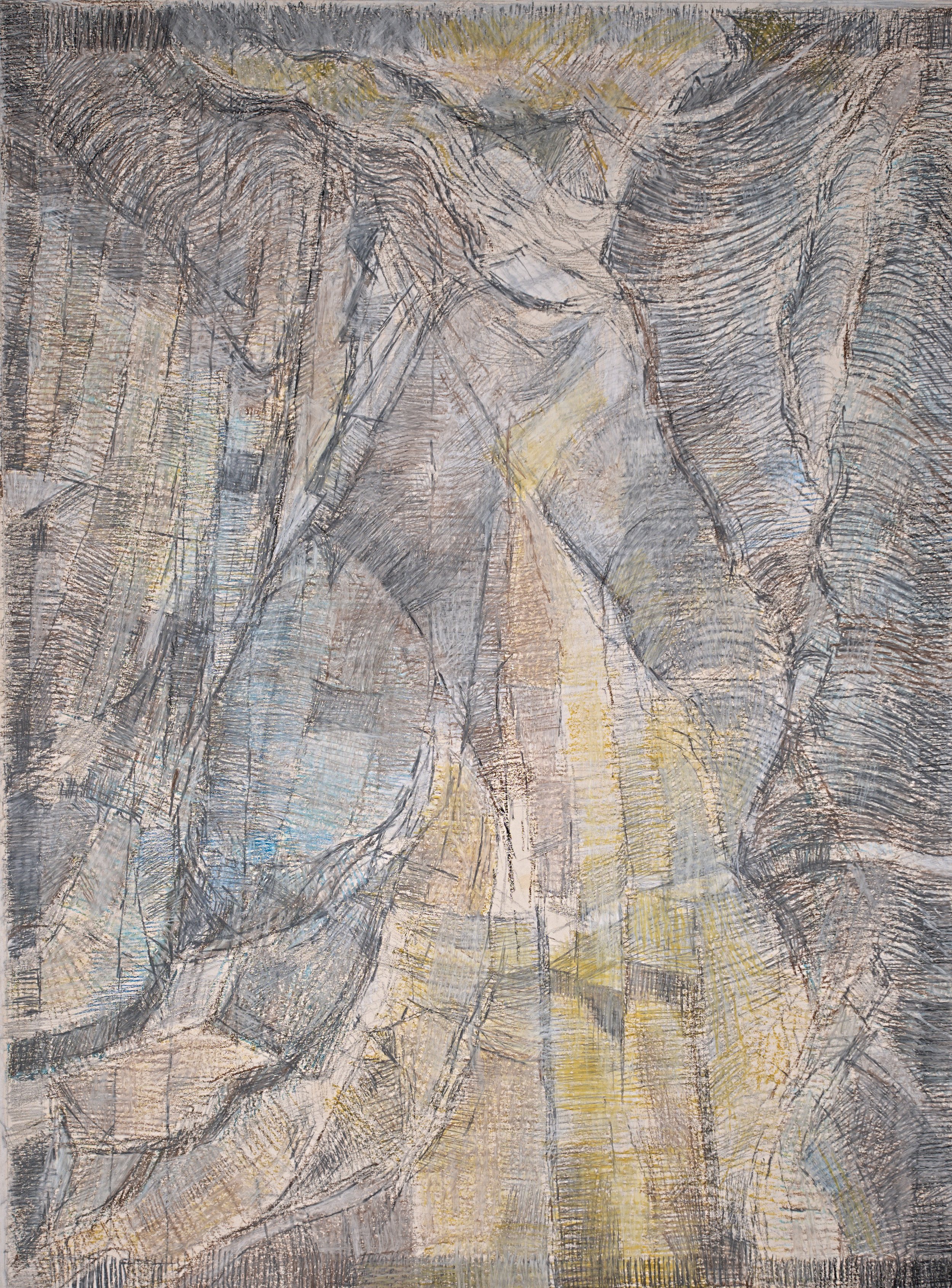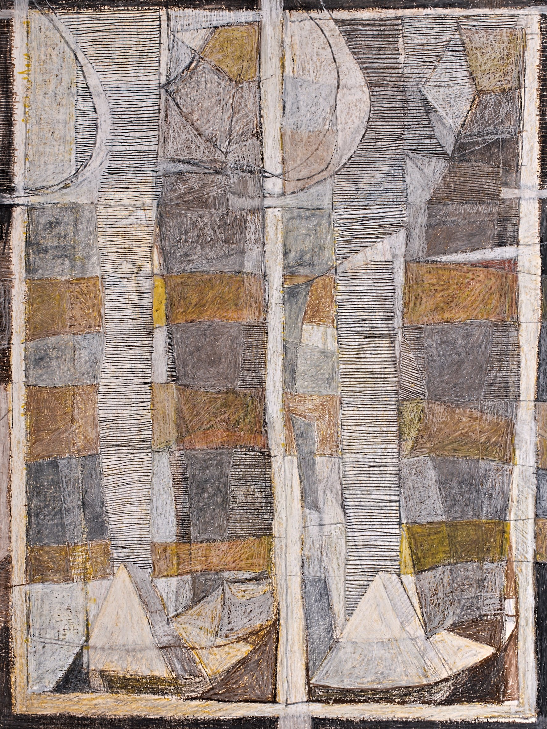 A rich palette of deep ochres, reds, and pale greys runs throughout the works, echoing both the veined rock which can be found surrounding Thorns Gallery and the weathered surfaces of York Minster. Through these tonal relationships, Attree draws subtle parallels between landscape and architecture while also weaving in his artistic influences from Northern European masters such as Pieter Bruegel through to the Canadian American abstract minimalist painter Agnes Martin with distinct markmaking and composition.