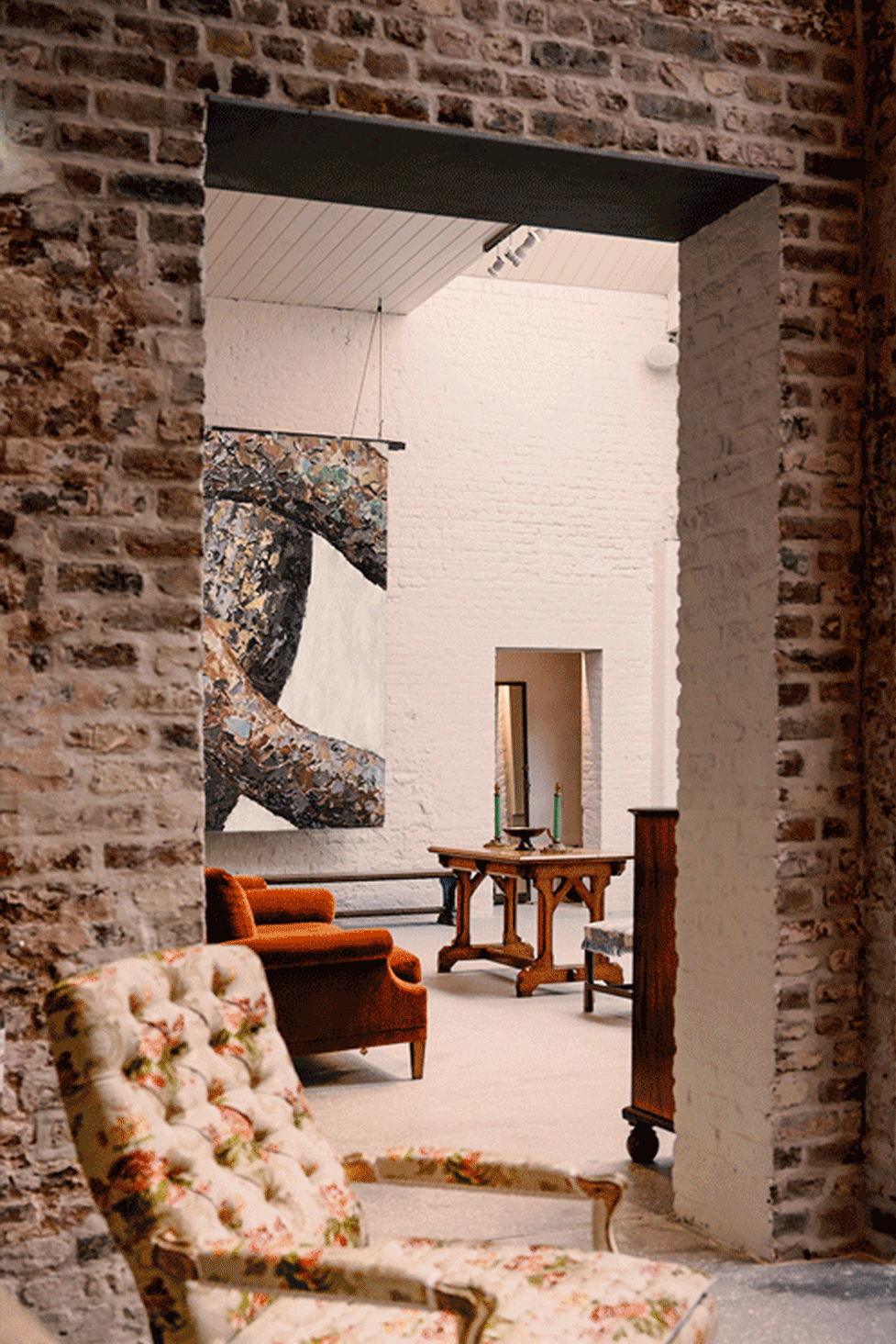 The tapestries will be shown in a recreated artist studio setting featuring a special selection of Christopher Howe’s furniture and rugs from Woven.